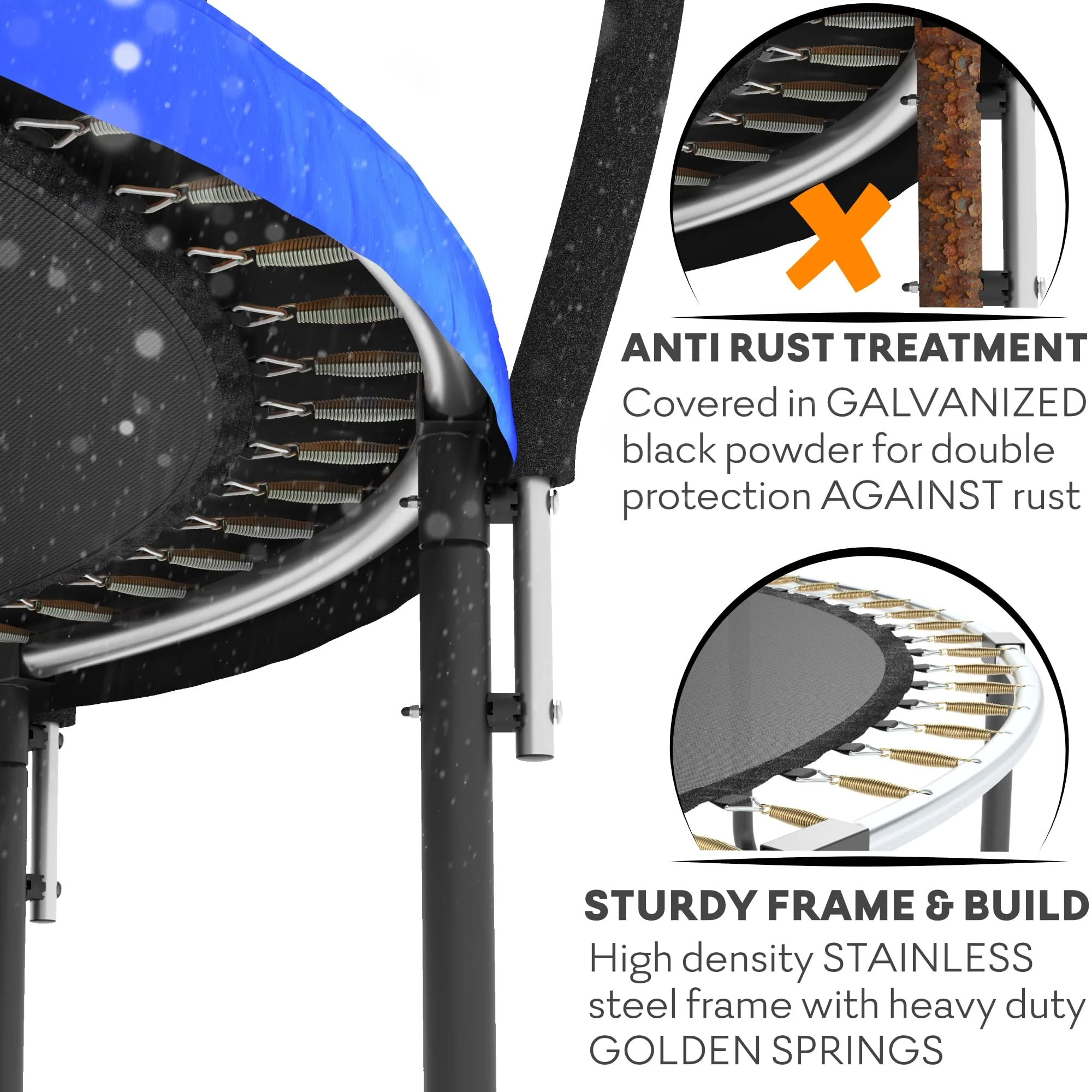 - Kids just wanna have fun - for a long time! We want your Jumpzylla super trampoline to look good as new for as long as possible! The frame is galvanized inside-out and the legs are powder coated for extra protection against rust, the thick foam is waterproof, so your new trampoline has a longer product life. And because we want to go the extra mile, we added the luxury plastic covered ladder for easy access and a comfortable use of your in kids trampoline for toddlers and older kids.