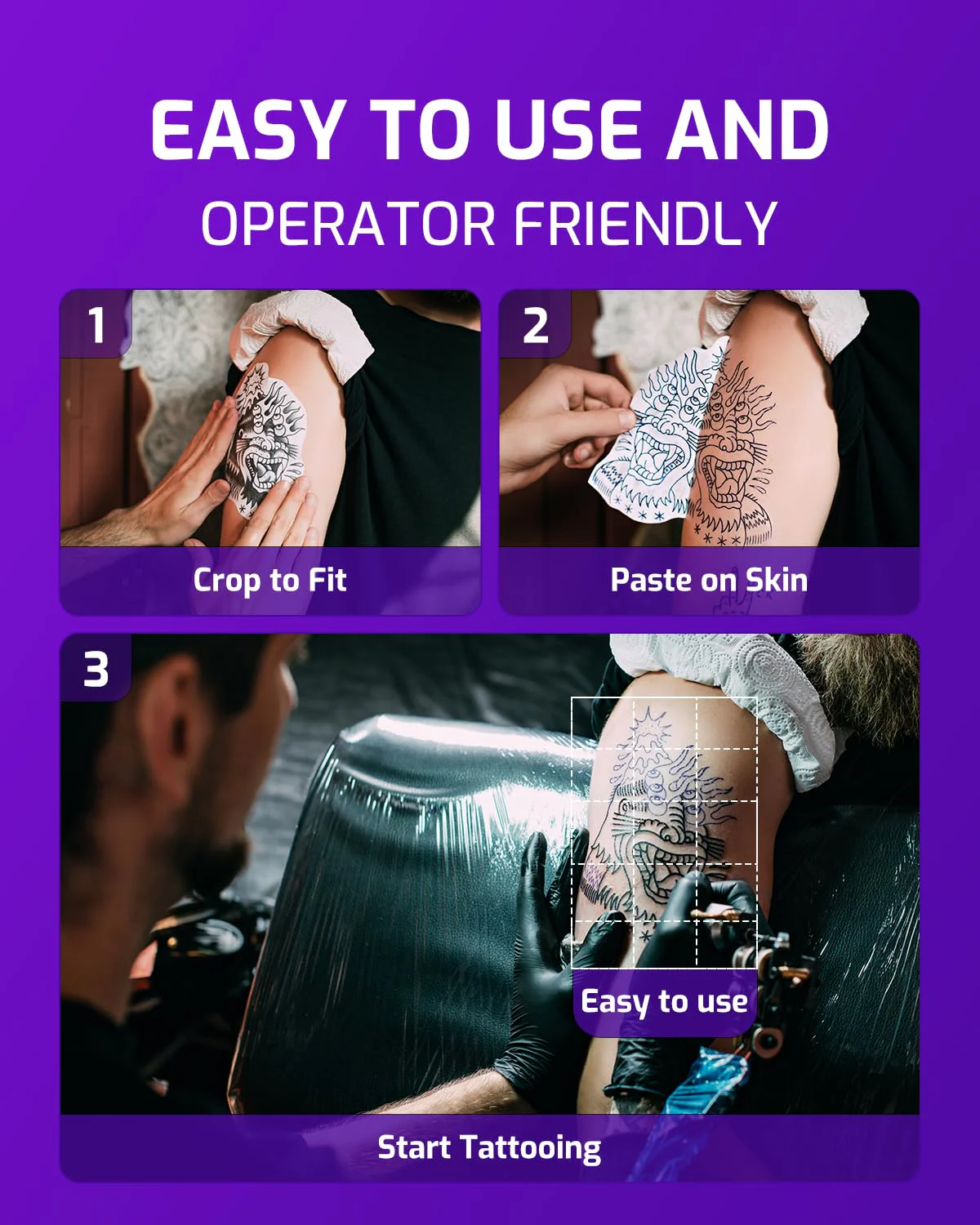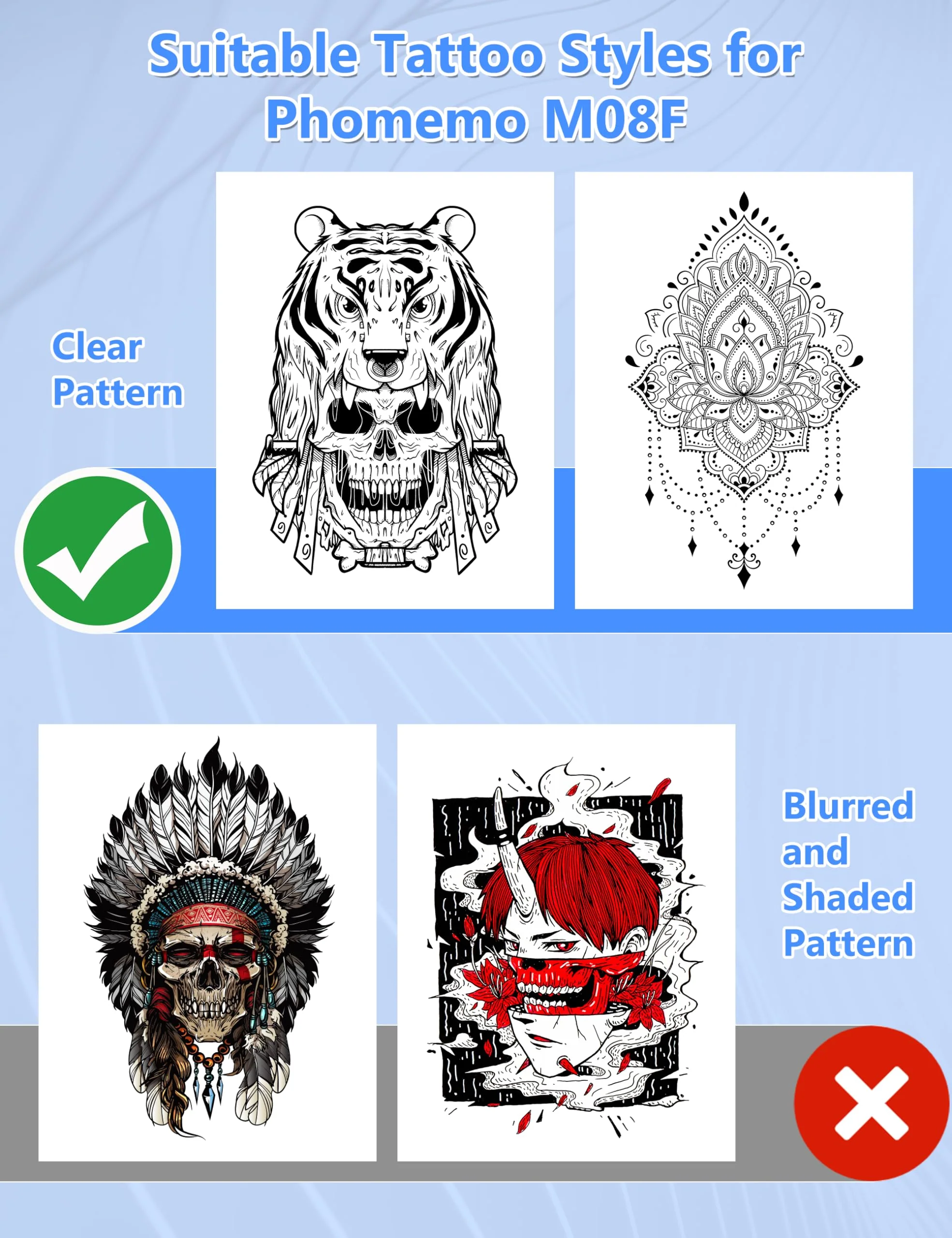 - [Simple Operation] Phomemo M08F tattoo stencil printer is a machine specifically designed for tattoo enthusiasts. You only need to operate the app in a few simple steps to print and tattoo transfer paper, greatly improving work efficiency, reduce time for hand drawn tattoo patterns.