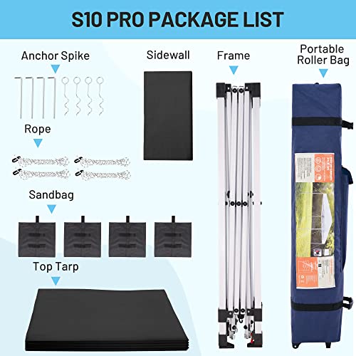 - S10 Pro Series: Ez one push pop up canopy, 10" x 10" canopy space, 210D polyester & PU fabric and reinforced frame, including sidewall, sand bags, wheeled carry bag and other accessories.