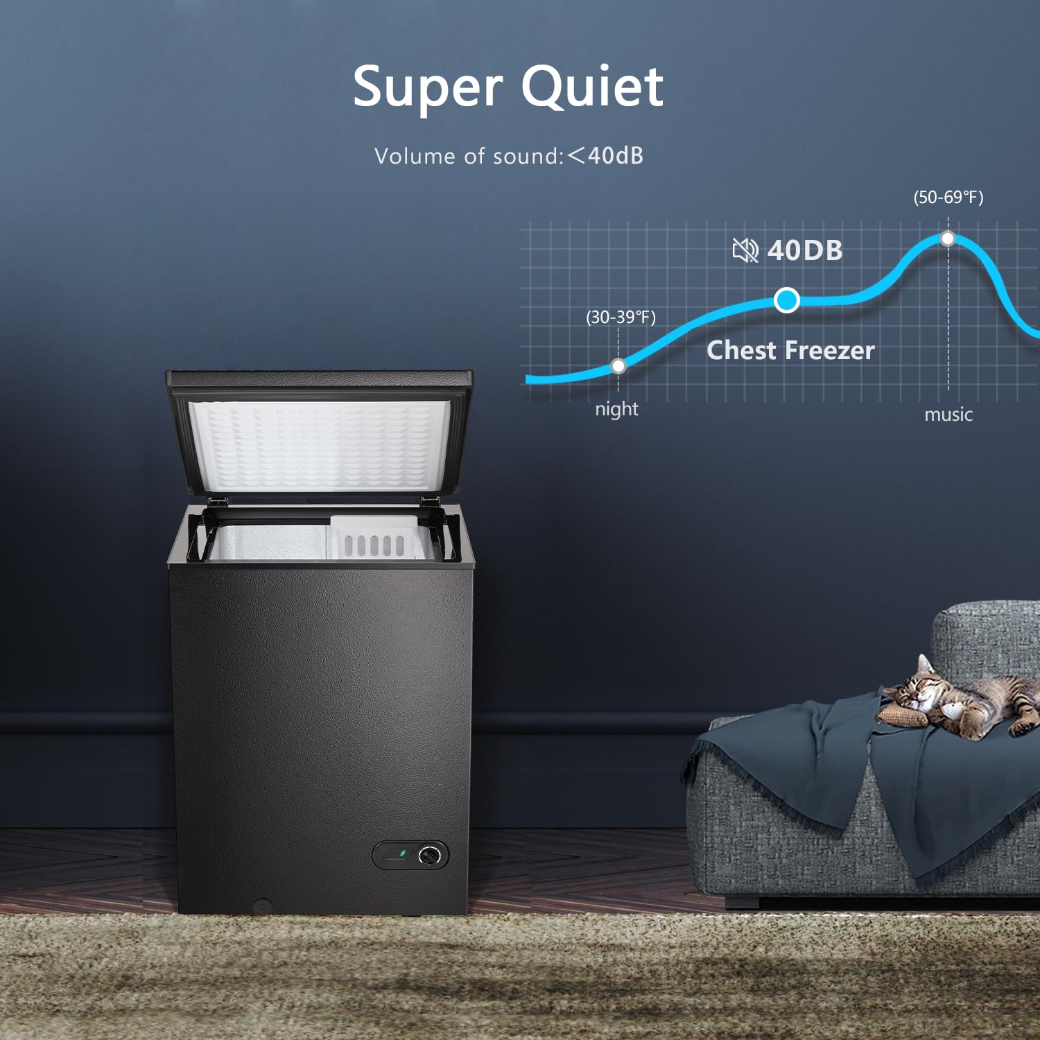 - 【Efficient & Quiet Cooling System】The chest freezer adopts an energy-efficient compressor that only consumes 0.6 kWh per day, greatly saving your electricity bill. What’s more, the compressor works at a noise level ≤ 40 dB, so no matter day or night, it will not affect your normal work and rest.