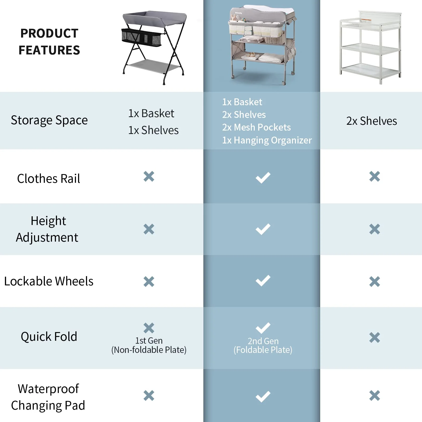 - PATENT DESIGN & CERTIFICATION - The classic square of changing table dresser is more popular with the public, and combined with the latest foldable and mobile function. Sweeby changing table has passed CPC certified to meet or exceed all safety standards set by ASTM. Made of 100% virgin materials, excluding waste recycled materials. This is the exclusive patented design of Sweeby.