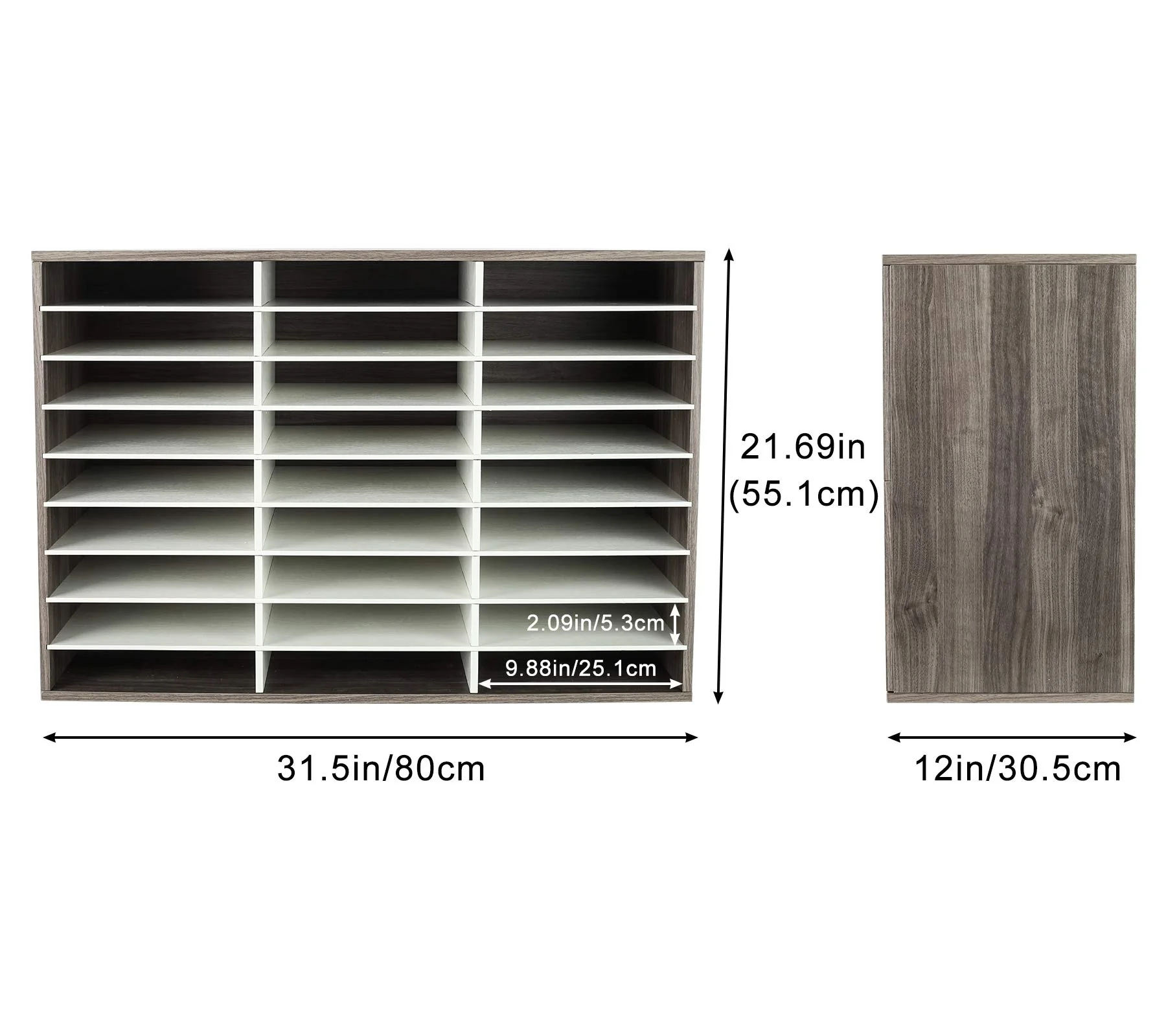 - Dimensions - The total dimensions of our mail sorter: 31.5W x 12D x 21.69H inches, with each compartment measuring 9.88W x 2.09H inches. We always encourage our customers to check the size before purchasing to ensure it meets their needs.