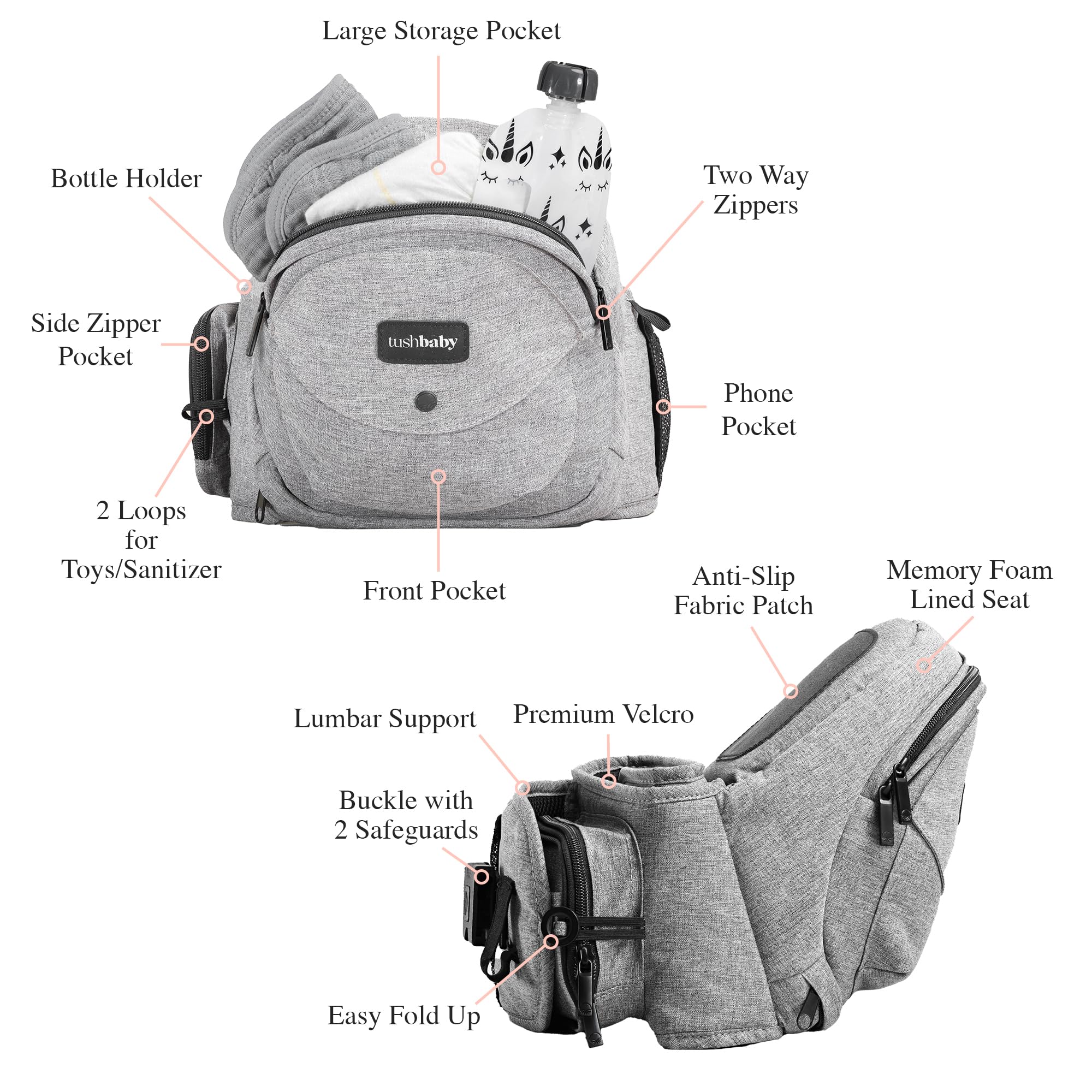- MULTIPLE STORAGE POCKETS: TushBaby doubles as a diaper bag with large storage pockets. Throw diapers and wipes in the storage beneath the seat. Access your keys, phone, and pacifiers in the side pockets. Store a bottle in the holder. Attach toys & sanitizer to the loops. And fold it right up for easy transport. Leave your stroller, clunky carrier, purse, and diaper bag in the minivan.